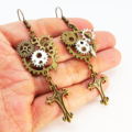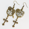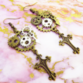 シルバーカラー(銀古美色)とアンティークゴールド(真鍮古美)をミックスさせたロザリオと歯車・ギアのピアスです