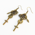 アンティークゴールド スチームパンク風ロザリオ(十字架)と歯車・ギアのピアス 時計の針