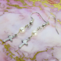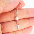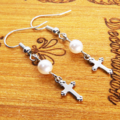 シルバーカラー ロザリオ(十字架)とスワロフスキーパール(クリスタルホワイト)のコンパクトなピアス サージカル可