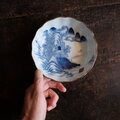 青い山水図◆線描きで素敵。伊万里 染錦金彩膾皿 深皿 骨董/antiques 明治期