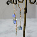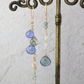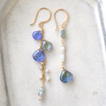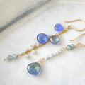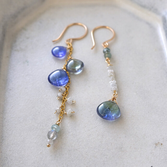 粒子状の断面が濡れたようにキラキラと輝く原石ダイヤ、マリンブルーの澄んだ色合いが美しいブルージルコンなどきらめく石をあわせてアシンメトリーなミドルレングスピアスに仕立てました。