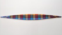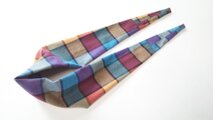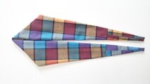 剣先のストール。端にかけて先細になるようデザインしました。起毛のコットンで、ターコイズやパープル、アプリコットなどのブロックにブラウンの格子が織り込まれたチェック柄です。