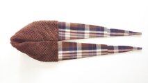 端にかけて先細になるようデザインしました。直接肌に接する中央部にはポコポコ感触のパイナップルボアを、左右の結び目側にはタータンチェック柄のコットンを配置しました。当ショップ既存の『肌ストール』パターンで異素材を合わせて作った秋冬マフラーです。