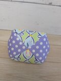 グリーン×パープルの柔らかな配色の生地に合わせパープルの水玉の生地をアクセントにし、たくさんの可愛いインコさんたちも相まってキュートな印象に仕上がりました。