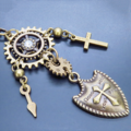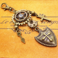 アンティークゴールド 歯車と盾(シールド)モチーフの組み合わせたスチームパンクキーホルダー バッグチャーム 金具変更可