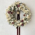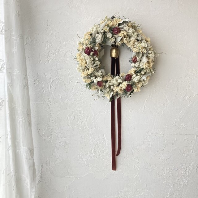 クリスマスの後は、ベルとリボンを外して、冬のリースとしてたのしんでいただけると思います。
