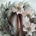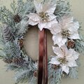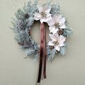冬の澄んだ空気と静けさを表現したクリスマスリースです。3輪のポインセチアはお花の中央にゴールドのグリッターとビジューがあしらわれ豪華ながらも上品な輝きです。また、2色使いにして長めに垂らしたリボンもこのリースの魅力です。ブラウンのサテンリボンと、透け感のあるベージュのオーガンジーリボンがリース全体を優雅でシックな印象にしています。大小の松ぼっくりはナチュラルな温かみがあり、雪化粧をしたかのようなフロストリーフは見る角度によってキラキラと輝いてクリスマス気分を演出してくれることでしょう。この冬、優美な冬の彩りであなたの空間を特別なものにする極上のリースです。小さな松ぼっくりはドライ素材、それ以外はアーティフィシャルです。横幅約33cm、縦長さ約50cm(リボンの長さ含む)、厚み約10cm