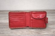 片側に小銭入れのボタンポケット、反対側にカードポケットが4つとそれぞれの中心側の脇にスリットポケットを一つづつ備え、その後ろにお札を入れるポケットがあります。