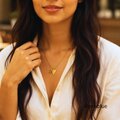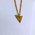 トライアングルチャームと組み合わせたエスニックモードなネックレス。