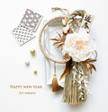 柔らかな色合いの中にも、プラチナゴールドの水引飾りやタッセル、迎春ピックなど、和のアイテムたちが日本の厳かなお正月を感じさせてくれます。