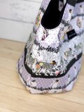 やさしい水玉のラベンダーカラーに、猫や草花の模様が描かれたかわいらしいまる型バッグです。