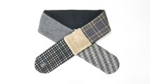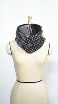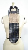 黒・グレー系のウール混やボアなどの秋冬生地をつなぎ、内側に滑らかな肌触りのフリースを合わせました。シンプルな一回結びのほか、首回りにふた巻きし、両端のスナップボタンで留めることが出来ます。