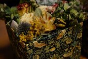リバティ柄とアレンジされた花が引き立てあい、シックで華やかな印象。