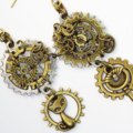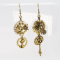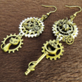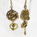 猫と鍵のチャームを片方ずつに配した歯車・ギアのアシンメトリーピアスです(イヤリングに変更が可能です)