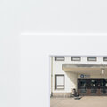 フィンランドの古都トゥルク、バスターミナルのエントランスの風景。売店の看板と吊り時計、大きなひさしと大きな扉。ひとつひとつの要素が、美しい色のトーンのなかで調和しています。