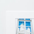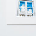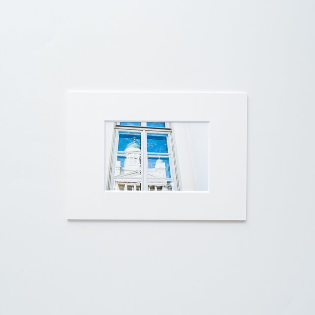 フィンランド国立図書館の窓に映るヘルシンキ大聖堂。青い空のなかに浮かび上がる白い建築は、静けさを伴いながらも厳かな佇まいをしています。