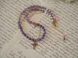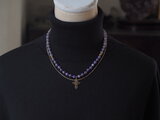 繊細な透かしのクロスに合わせたのは3種類の菫色の石たちです。ヒーリングストーンとして知られているチャロアイトを中心に、半透明のパープルカルセドニー、そして希少なティファニーストーンの優しいハーモニーが心を癒してくれます。