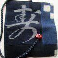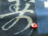 中綿を入れ、男絣で作ったループを付け、ループの先に、山サンゴと黒真珠を付けています。