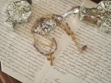 今年のクリスマス作品は、長年かけて集めたキリスト教聖品(クロス、メダイなど)を使って制作することにしました。中学高校とミッションスクールに通った私は、キリスト教信者ではありませんが、毎月のミサやクリスマスなどの特別なミサにも参加し、毎朝放送で流れる祈りも唱えていました。ごく自然にキリスト教に接していたため、クロスやメダイ、ロザリオなどを集めるのが大好きだったのです。その中から作品のイメージに合うものを選び制作いたしました。