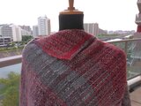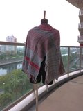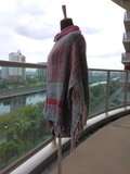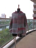 手織の布から仕立てましたポンチョです。色合いはグレーと赤です。材質はウールです。サイズは胸幅背幅共に72センチ、着丈は63センチです。ゆったりと着られます。フリーサイズです。どの角度のところを前にしてもちょっとおしゃれな着方が出来ます。