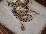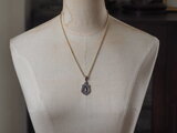 今年のノエルは、どうしてもラピスラズリを使ったブルークリスマスにしたかったので、ラピスラズリに合わせてグアダルーペのマリアのメダイを選びました。このメダイはシルバー925製なのですが、中央の部分に金メッキが施してあるため、とても華やかでゴールドカラーのパーツともよく合います。ラピスラズリは色のトーンや、カット、大きさを変えたものを使い華やかに仕立てました。メダイは別仕立てなので、単独でつけたり、他のネックレスと合わせたりと、ご自由にお楽しみいただけます。
