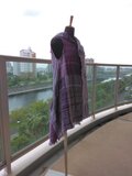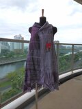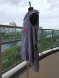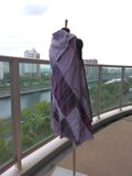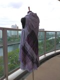 手織の布から仕立てましたベストです。材質はウールです。サイズはフリ―です。前開きの形です。前身ごろは右身頃は横ぎれ左身頃は縦ぎれで布の向きが左右異なります。後ろは斜め布です。着丈は82センチ、胸幅、背幅は50センチです。色合いは紫から藤色迄の濃淡で織っています.