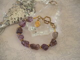 この石を見た瞬間に、ブレスレットを作ろう!と思いました。原石の趣を残したまま表面を滑らかに磨いたガーデンアメジストはまさには私の好みです。ブラスのビーズを間に挟んだだけのシンプルなデザインですが、これで十分素敵だと思います。チャームはマリア様のメダイです。