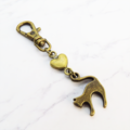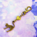 アンティークカラー(真鍮古美色)の跳ね猫とハートの大人可愛いファスナーチャーム キーホルダー マスクチャーム