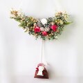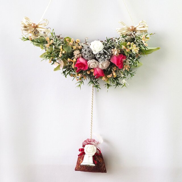 フェイクフラワー、ドライ素材などをあしらった半月型のリースに、