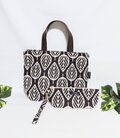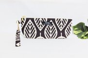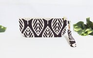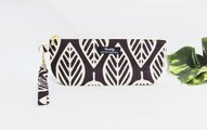 北欧風リーフ柄ブラウン色の綿リネン地の持ち手付きペンケースです。