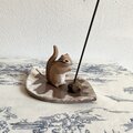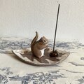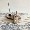 りすは白土と赤土を最高温度1230度で焼き、その後アクリル絵具で彩色、やすり掛け、目は新うるしで光っています。