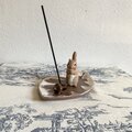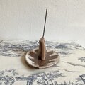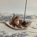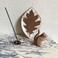 受け皿はアカナラの葉を象りしたもの、赤土で作り、縁には白化粧土を塗り全体に透明釉薬を掛けています。こちらも2度焼成。
