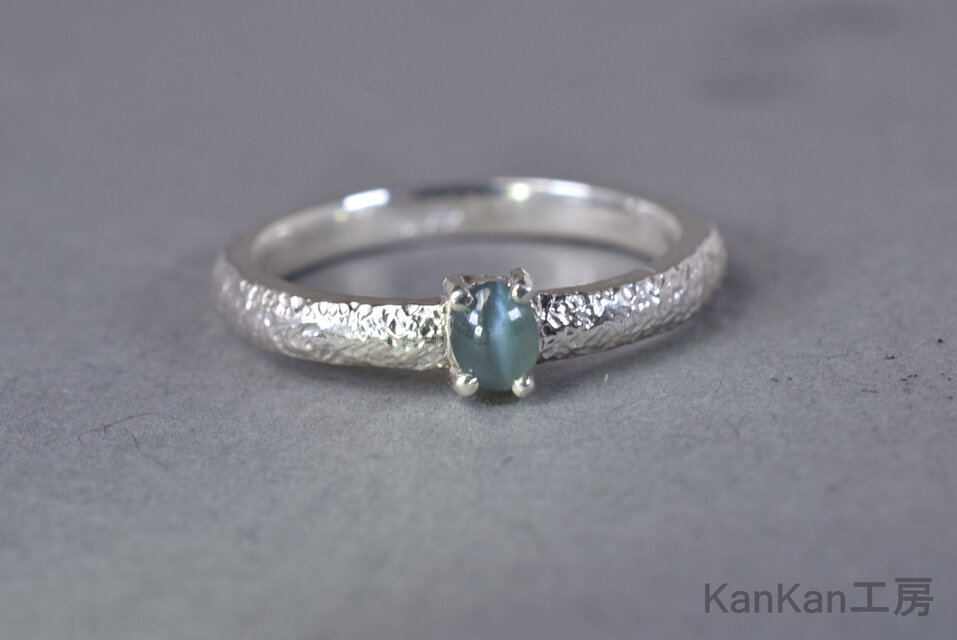 リング腕は、甲丸全周に極小の槌目を入れ、鋳肌のようなテクスチャーで仕上げており、手なじみの良い着け心地です。