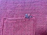 襟ぐり・袖ぐりは縁編みをしていますので、ゆるく織った手織り布の伸びや縫い目の裂けを防いでしっかりとした仕上がりになっています。