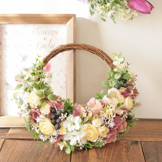 細めのリースベースを生かしたデザインなので、ナチュラルな雰囲気で飾っていただけます。