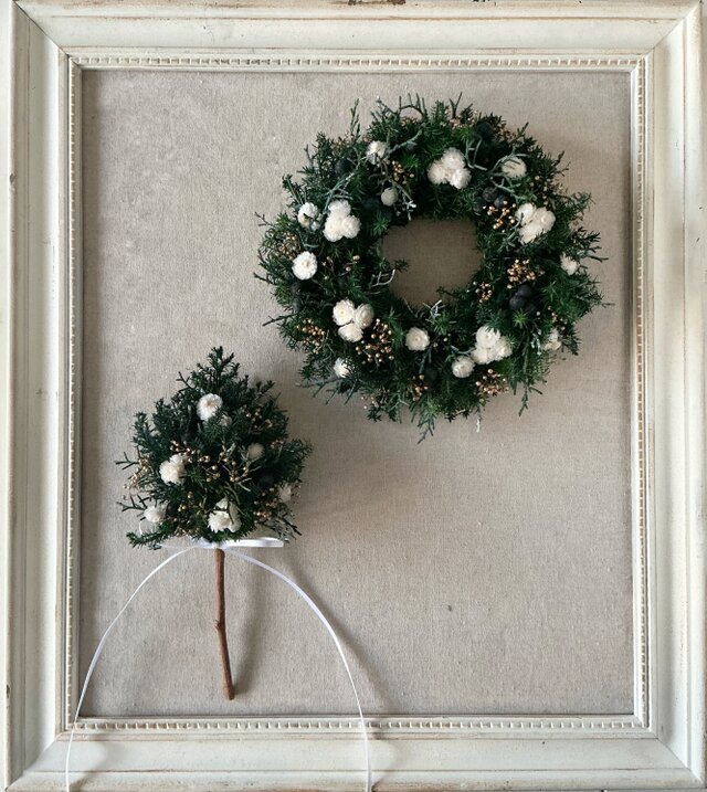 ヒムロスギとブルーアイスをベースに、イモーテルやシャリンバイ、かすみ草をアレンジしたツリーとリース。