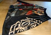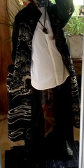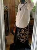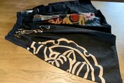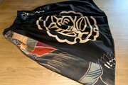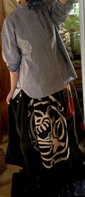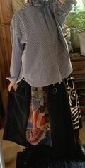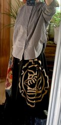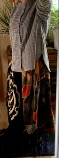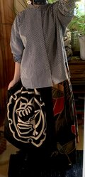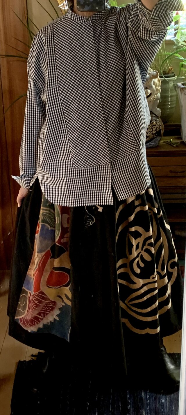 幟旗と家紋を組み合わせて黒をポイントにパッチワークスカートを作りました