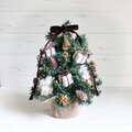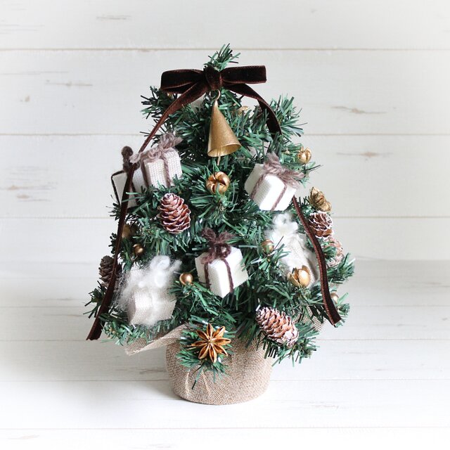 ふわふわ毛糸リボンのプレゼントボックスや木の実、ゴールドのボールピック、ベルベットリボンを散りばめた、ナチュラルで温かみのあるミニツリー。