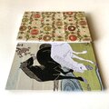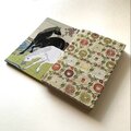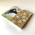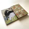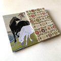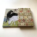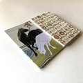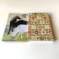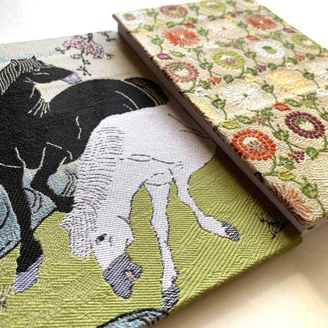表紙の淡い緑や生成りの色彩が春の穏やかな空気感を醸し出し、黒と白の馬を際立たせています。一方、裏表紙の金襴織は格式の高さと優雅さを演出します。持ち主様に細やかな幸福をお届けできますと幸いです。