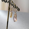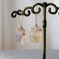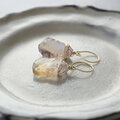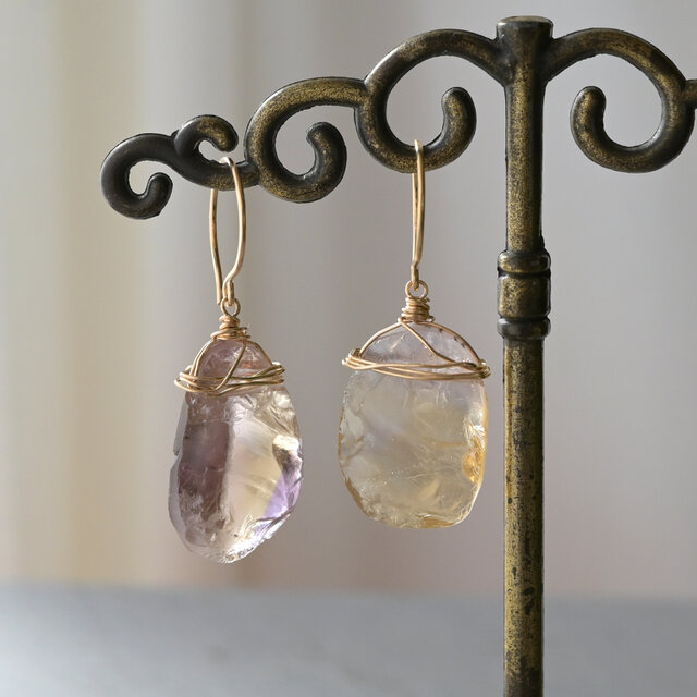 アメジスト(紫水晶)とシトリン(黄水晶)が混ざりあったバイカラーの水晶「アメトリン」のラフロックタンブル(ハンマーロックカット)を使ったピアスです。原石を割っただけのナチュラルな形状で、切り口の氷のような澄んだ輝きと艶が魅力的です。