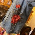 トップスにはヴィンテージ風の風合いが味わい深いインディゴデニムを採用し、肩とサイドには艶やかな赤い薔薇の刺繍モチーフを。