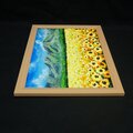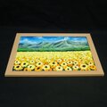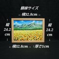 こちらの油絵は、サイズ横272mm × 縦242mmで、質の高いホルベインの油絵の具を使用し、鮮やかに描かれています。シンプルでナチュラルの額縁は、どんなインテリアにも美しく調和し、特別な空間を演出します。壁掛け用の金具も付属しているため、お好きな場所に手軽に飾ることができます。「くじゅう花公園 夏のひまわり畑」は、大切な方へのプレゼントや特別な贈り物としても自信を持っておすすめいたします。
