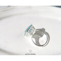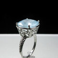 明るいブルーにラメ状の内包物がキラキラと輝くモスアクアマリンを、唐草と透かし模様の台座にセットしたリング。