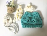 フェイクワイン小物、手編みセーターわマフラー、ニット帽、手編みリュック。花かご