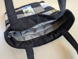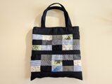 黒色の生地をベースに、いろいろな生地を使った、ぺたんこバッグです。