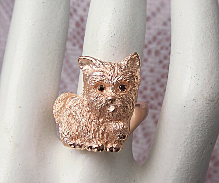 シルバー製:ピンクゴールド仕上・ヨークシャテリアのリング(ブラックダイヤモンドの瞳)*あなたの誕生石もセットできます。