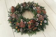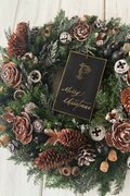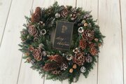 ヒムロスギやコヒバをベースにし、シダローズを中心にクロエゾマツやユーカリの実、シャーリーポピーなど様々な木の実やドライフラワーなどをアレンジしました。