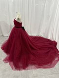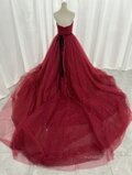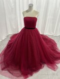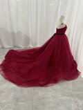 人気上昇!カラードレス ボルドー色 ベアトップ シークインチュール ロングトレーン 編み上げ 花嫁 披露宴