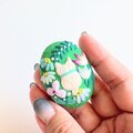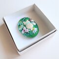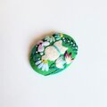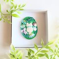 サーモンピンクの地に黒い花の刺繍、ありそうでなかったこの色のとりあわせ、すてきなブローチでした。