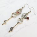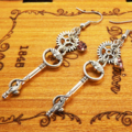 アンティークシルバーの鍵に座る猫モチーフと歯車を組み合わせたスチームパン風のピアスです